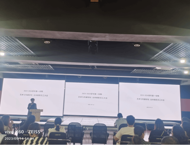 2023年9月14日下午,艺术与传媒学院在405报告厅召开新学期全院教职工大会,部署新学期各项工作,学院院长程丽琴主持会议。