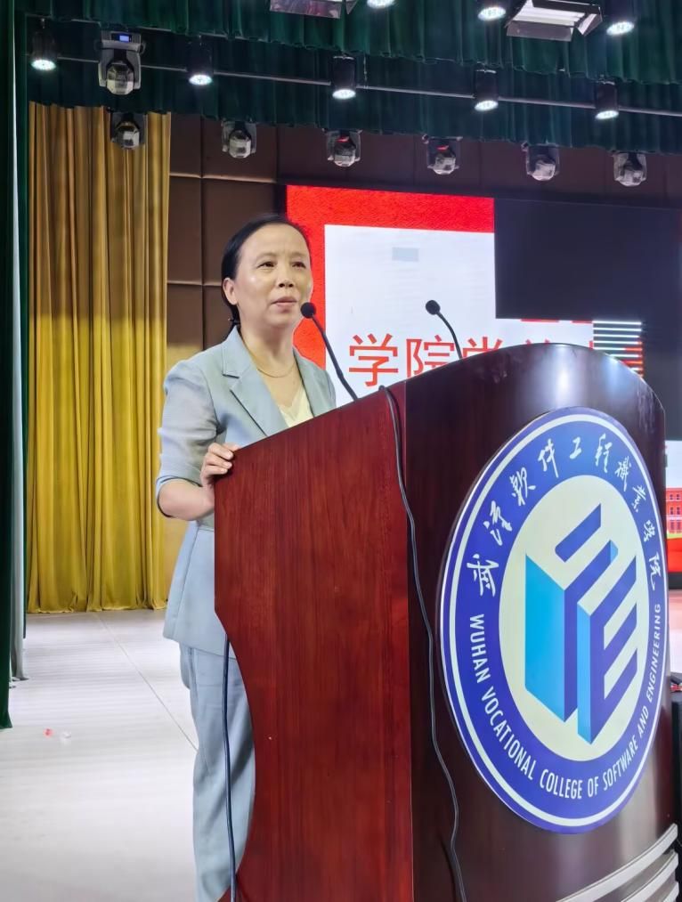 学院党总支书记肖新梅致辞,她围绕“如何在武软‘卷’出特色”、“如何在AI时代立足发展”等主题,鼓励新生要主动适应角色转变,勇于尝试、善于变通,争做“懂艺术的科学家”,推动技术与艺术的融合创新。肖书记强调,学生应积极参与学校项目,紧跟时代步伐,避免闭门造车,同时也要走进自然、拓宽视野,为个人发展明确方向。