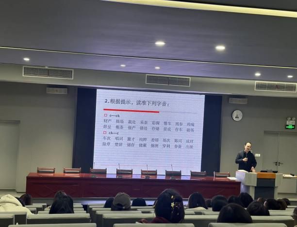 课堂以 “实用 + 精准”为核心,陈刚老师先聚焦普通话测试高频难点:从基础读音辨正入手,通过 “字 — 词 — 句” 阶梯训练,对比平翘舌、前后鼻音等易混音的发音部位与口型,用 “捏鼻体会法”“声调夸张法” 等趣味技巧,让抽象语音规则直观可感;随后解析同音字、近音字辨析,结合艺术专业语言需求,举例纠正生活中易错字词,还邀请同学现场示范、逐字修正细节。