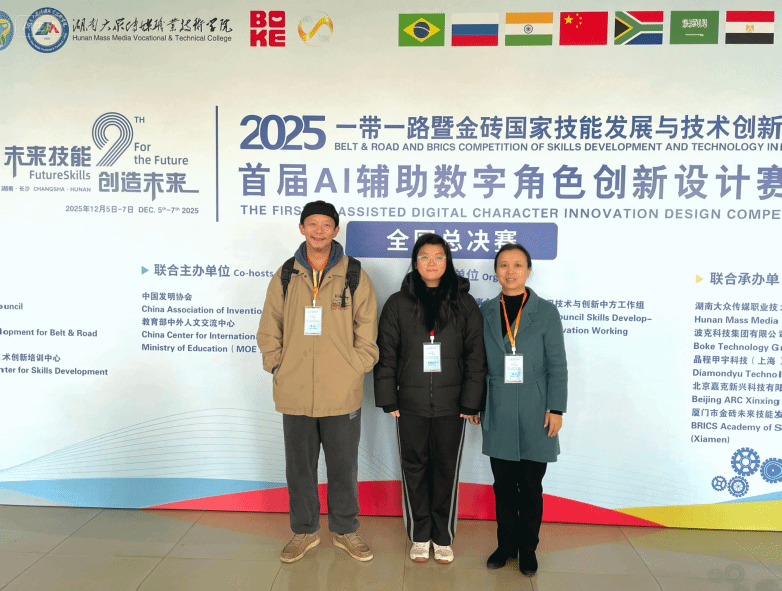 (通讯员:胡明)12月5日至7日,“2025‘一带一路’暨金砖国家技能发展与技术创新大赛”首届AI辅助数字角色创新设计赛项全国总决赛在湖南大众传媒职业技术学院举行。由我院胡明老师指导的数媒专业2302班郭诗彤同学,在党总支书记肖新梅的带领下以分赛区二等奖的成绩晋级全国总决赛,与来自全国近百所院校的教师、高职、本科及中职四个组别近百名选手的层层角逐,最后夺得高职组三等奖。