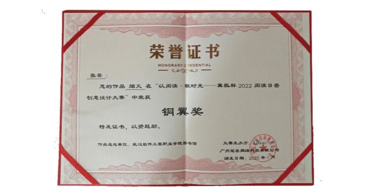 据统计,本次大赛共有来自全国200多家图书馆的1764位参赛者参加,最终征集到近2000件作品,其中审核通过1273件。活动期间,我馆积极宣传,认真组织,全校共9名学生参加此次活动。本次竞赛我校共选送11件作品,其中数媒2001班张芸同学的作品 -《烟火》获得铜翼奖,辅导老师南方老师获得优秀指导老师奖。