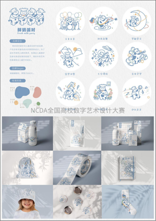 设计说明:作品为鲜奶派对VI设计。鲜奶派对是针对儿童成长的牛奶品牌产品含有丰富的成长所需营养成分。为了迎合市场和人群的需求,在满足儿童喜好及家长购买标准的前提下,用奶牛的艺术形象展现出儿童艺术成长。