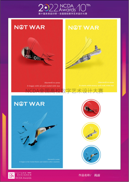设计说明:作品《揭露》选用当前社会热点战争为切入点做反战宣传海报。海报的表现手法采用折纸效果,画面更有层次感、视觉冲击力增强。其实反战的最本质是反对战争的源头,只有把战争的源头反掉,才是真正的反战。折叠卷起的纸张是炮弹,枪杆,飞机的形状代指战争,露出的石油,美元,白头鹰代指化石能源为主的不可再生资源,金钱和美国。体现了战争的最根源是对生产资料和金钱的争夺以及导致战争最多的美国。海报背景用鲜艳醒目的红,黄,蓝颜色起到警示作用。