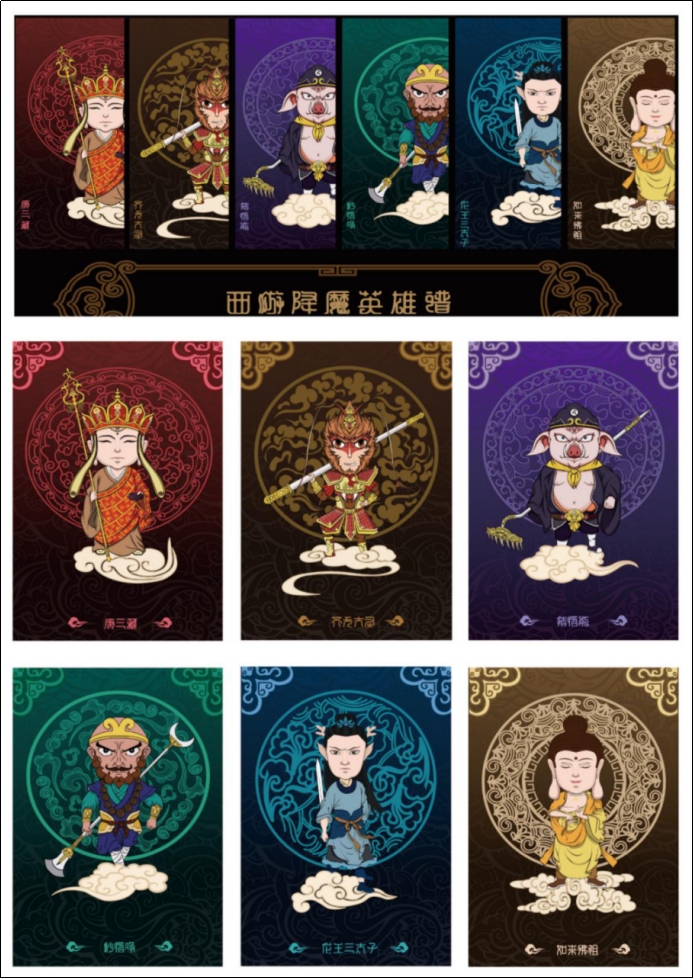 设计说明:西游降魔英雄谱的图形设计,总共设计了六种图案。用我们熟悉的西游人物形象进行创作,既保留了西游记人物的性格和外形识别性,又添加了一些Q版人物动作,通过冷色系、暖色系、混合色系、金属色系等四组色彩方向进行产品开发。