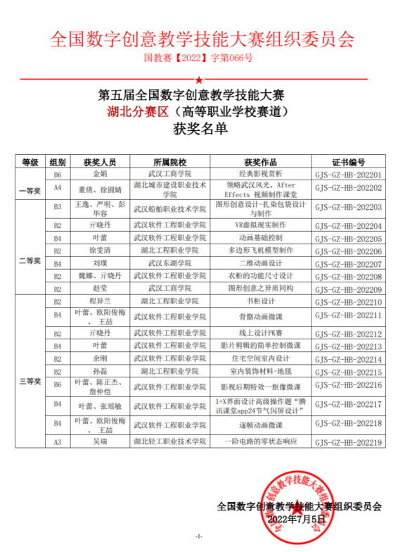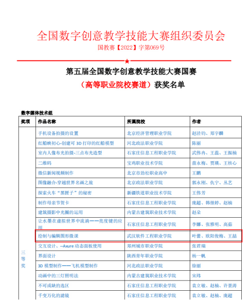 近日第五届全国数字创意教学技能大赛获奖名单揭晓,艺术传媒学院教师在此次大赛国赛中获得三等奖1项,省赛中获得二等奖3项、三等奖7项的佳绩。全国数字创意教学技能大赛由全国高等院校计算机基础教育研究会、全国数字创意教学技能大赛组委会主办,中国电子视像行业协会数字影像创意委员会协办,并被教育部高教学会正式列入《全国普通高校教师教学竞赛排行榜》项目。