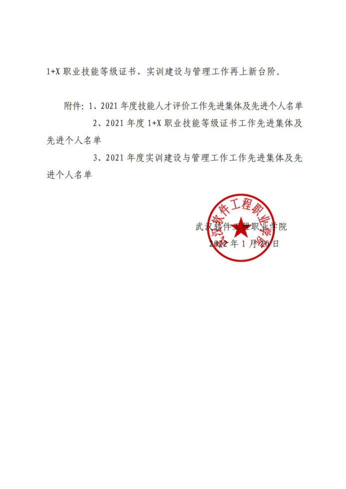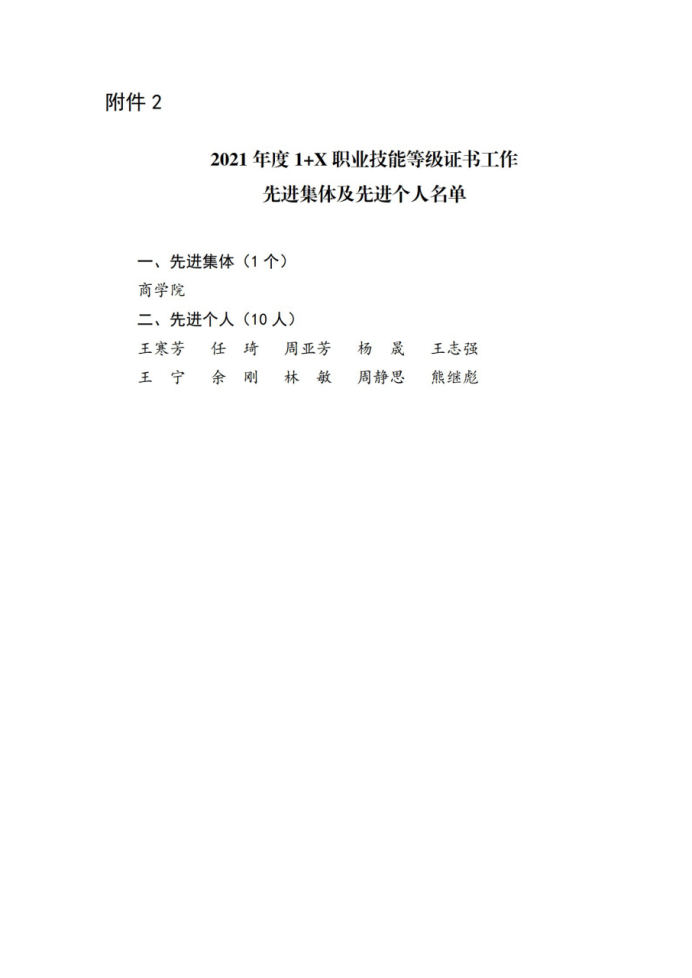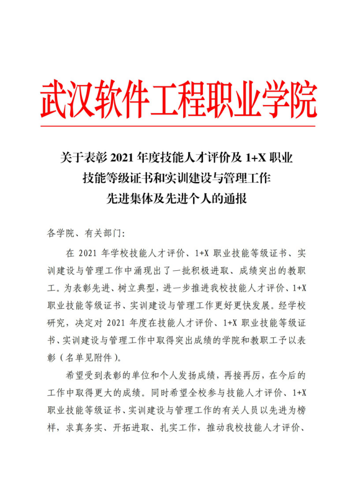 为表彰先进、树立典型,进一步推进我校实训建设与管理工作、学校技能人才评价、1+X 职业技能等级证书更好更快发展。经学校研究,鉴于我院2021年度中在实训建设与管理工作、学校技能人才评价、1+X 职业技能等级证书三方面的优秀成绩,决定授予实训建设与管理工作先进集体的光荣称号,并且王欢老师、叶蕾老师、余刚老师分别荣获实训建设与管理工作、学校技能人才评价、1+X 职业技能等级证书的先进个人。