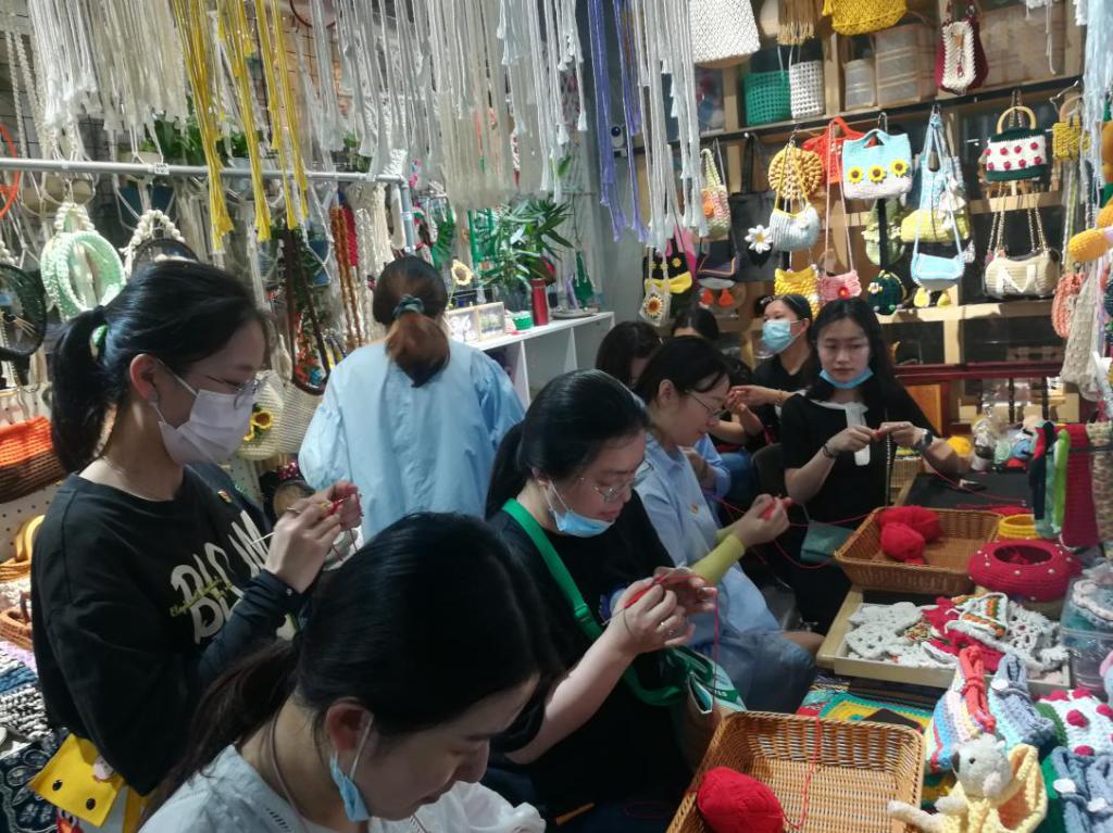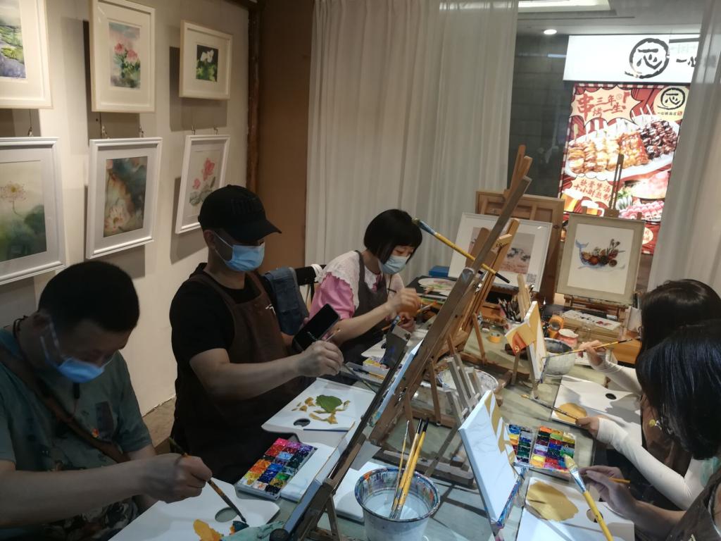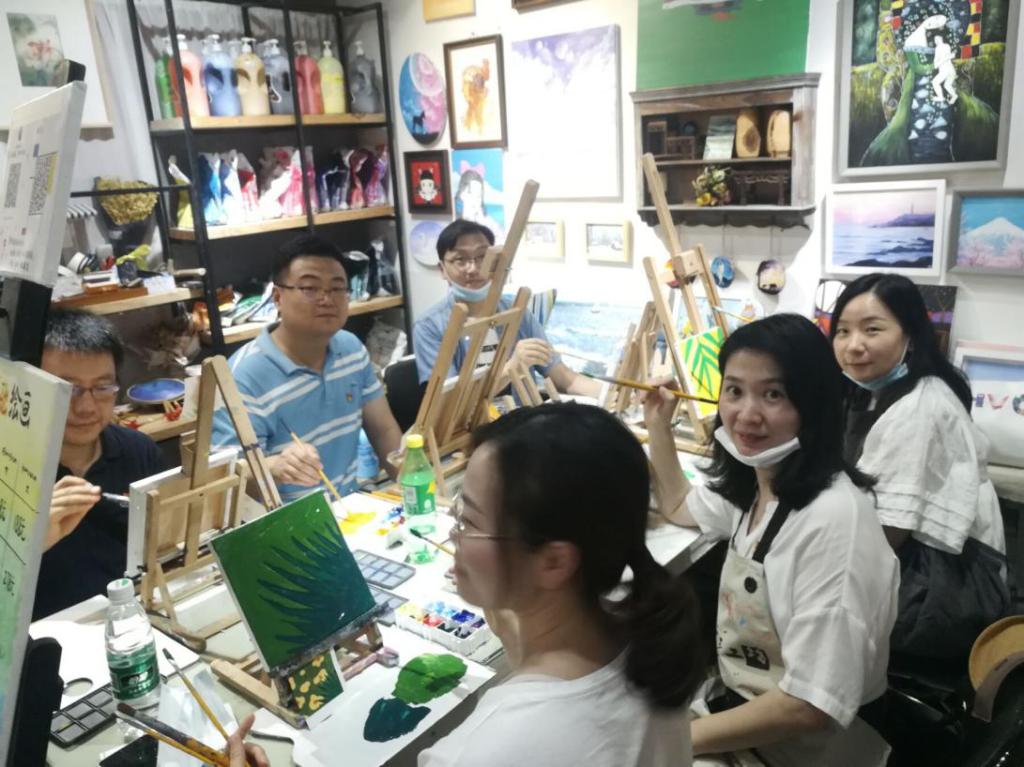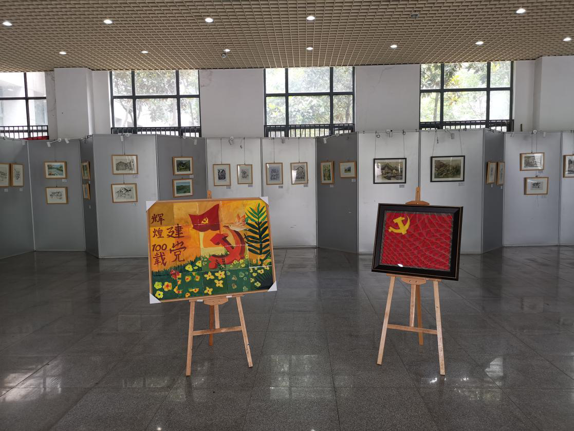 在参观完红色经典景区后,老师们激情澎湃,兴奋不已,来到了昙华林工作坊,将要在这里通过艺术作品的表现,来抒发对党的热爱之情。在分配好各自的任务后,党员老师们满怀激情投入到作品的创作中,有的党员画党徽图案,有的党员画党旗图案,有的写字,有的画花草树木,有的编织小红花,大家专心致志地去勾勒每一个线条,每一个图案,用排笔认真地涂抹色彩,这每一笔都表达了大家对党和国家的拳拳赤子之心,都印刻了对党的深深祝福。最后,大家同心合力,将自己所学专业与建党百年的风华历史结合,完成了《建党辉煌100载》和《百朵红花聚党旗》两幅作品,希望以此表达出对中国共产党百年华诞的美好祝福和对祖国的热爱。
