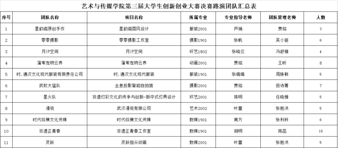 艺术与传媒学院第三届创新创业大赛于今年1月启动,参与学生共508人(占学院总人数的35.6%),指导参赛教师共21人,报名队伍共75支,经历了激烈的竞争与重重选拔,经专业导师的评审,最终有11支优秀的团队进入了决赛。