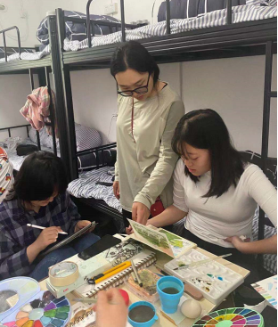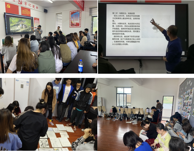 下雨只能安排学生在基地绘画,我们根据学生的普遍问题,在雨天安排教师有针对性的开展“大课”教学。老师们的讲座,打通班级,每个同学都可以来教室听,虽然没有强制要求学生到场,但是场场爆满,学生收获颇多。例如陈正杰老师为不擅长画速写的同学们开了一场速写技法讲座,重点示范了当前学生画不好的,如何瓦片、植物、石头等常见景色,詹仲恺老师为无法落笔画色彩的同学开了一场风景色彩讲座,示范从风景起形到细节刻画的完整步骤。除了讲座大课外,各班还会配合开展小课,每天早晚辅导员和带班老师要常规查寝,并利用查寝时间开“小课”,逐个寝室点评、修改作业,做到当天问题当天解决。