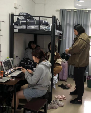 上图为辅导员王晶老师查寝、带班老师进寝室指导学生完善作业