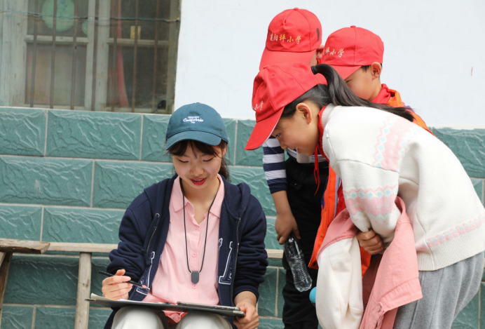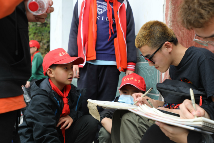 4月15日是阳光明媚的一天,也是我们宜昌线写生的第三天,同学们的身边多了一群特殊的小身影,这是兴山建阳坪小学的80余名小学生们。我们是第一批来到村里写生的大学生,孩子们得知有大哥哥大姐姐在自己的家乡画画,非常想来参观学习。建阳坪小学校长向我们表达了孩子们的意愿后,我们师生也非常想要帮助这些小学生们圆梦。孩子们一个个都乖巧懂事地围在同学们身边,同学们都热情地当起了小老师,耐心地解答孩子们提出的各种天马行空的问题,有的孩子拿出自己的小画本和同学们一起画,有几个孩子被哥哥姐姐的画征服,还成了同学们的“小粉丝”,向哥哥姐姐们要签名。