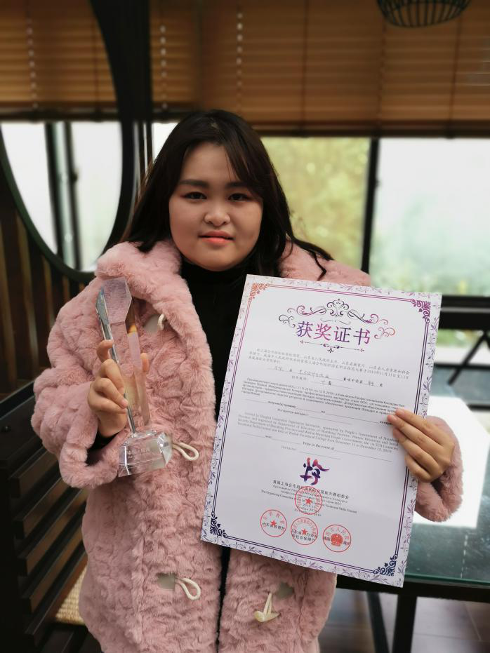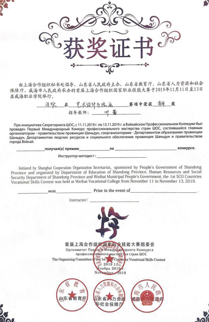 2019年11月11日,首届上海合作组织国家职业技能邀请赛在威海职业学院举行。经过层层选拔、评选,我院艺术与传媒学院教师叶蕾指导的马欣同学的作品在艺术设计与绘画项目比赛中喜获铜奖。