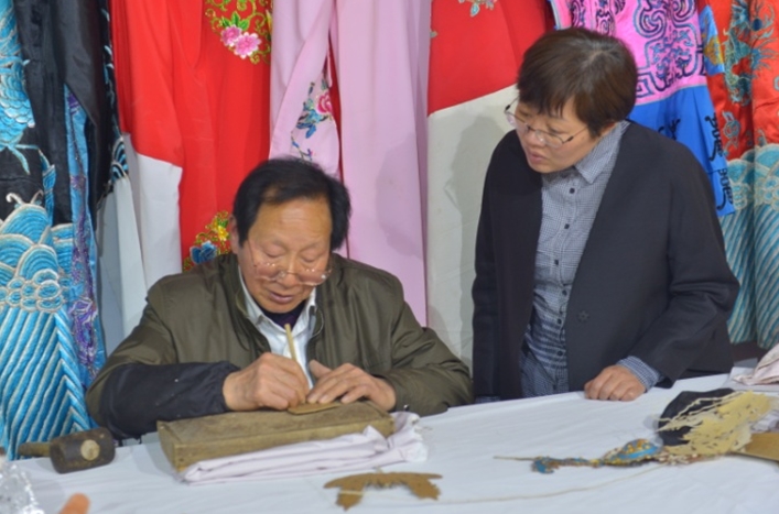 张宗明师傅讲解画图后在图形上扎孔,让油墨通过小孔成形图案的方法