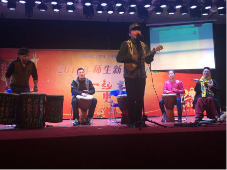 介绍完非洲手鼓的发展历史后,杨东老师带来了他的武汉Laya非洲鼓团队为我们现场表演。他们动情的歌唱和悦耳的鼓声表演,慷慨激昂,震撼心灵,引起了台下同学们齐声的喝彩。伴随着鼓声的节奏, 现场400多名学生都情不自禁地轻轻和着节拍,一起感受音乐节奏的美妙。