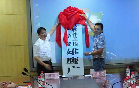 在签约揭牌仪式上,学校胡大平书记、马蜂校长、武汉世纪雄鹰广告装饰有限公司总经理陈波涛先生、设计总监刘洋先生、湖北楚才教育杂志总编周西超先生、多位行业界广告企业总经理和艺术传媒学院的教师代表、学校相关部门负责人,共同见证了“雄鹰广告学院”的诞生。在仪式上,武汉软件工程职业学院党委胡大平书记与武汉世纪雄鹰广告装饰有限公司陈波涛总经理为“雄鹰广告学院”揭牌,马蜂校长代表学校与雄鹰广告公司陈波涛总经理签订了校企共建二级学院协议,并对雄鹰广告学院的成立与发展提出了三点殷切希望: