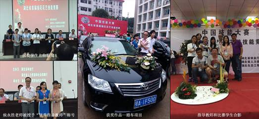 本次大赛由湖北省林业厅、湖北省人力资源和社会保障厅联合举办,由湖北省生态工程职业学院承办。来自湖北省20多所高职院校,与十多个园林花卉企业派出的50多个代表队冒着风雨进行了激烈的角逐,最终决胜出一等奖1个队,二等奖2个队,三等奖5个队。我校代表队取得桌花、节庆日花篮、婚车三项比赛项目总分第二名的好成绩,并获得本次比赛二等奖。我校参赛学生田荣和罗才同学被授予“湖北省技术能手”称号,参加比赛的指导老师侯永胜、胡明、余刚、张晓云、王婷老师同时被授予“优秀指导教师”称号。