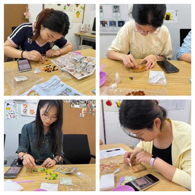 同学们领取材料包后,纷纷在底板上勾勒草图,大家充分发挥想象力,将抽象图案、卡通形象、校园元素等融入设计,专注地粘贴马赛克颗粒,遇到困难时,张丹老师耐心指导,现场气氛热烈,大家还互相交流创意、共享材料。活动最后,部分参与者手持作品合影,记录下这温暖瞬间