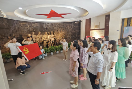 当天,在讲解员的带领下,在场教工党员一边聆听解说,一边认真参观。整个场馆分为《武昌首义》《新文化运动和“五四运动”》《建党》《北伐》《腥风血雨》《全面抗战》和《迎接解放》七个展厅。一张张图片、一件件实物、一幅幅场景、一份份史料,充分展现了江夏革命英雄在党的创建和大革命、土地革命战争、抗日战争和解放战争以及社会主义革命和建设等多个时段的历史篇章。参观活动结束后,在肖新梅书记的带领下,全体党员面向党旗庄严宣誓,重温入党誓词。